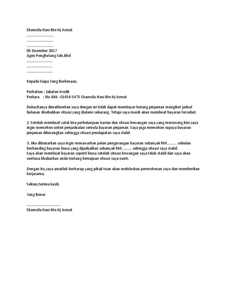 Contoh surat kuasa cetak rekening . Shamsila hani bte hj asmat. Contoh surat rayuan pengurangan bayaran akpk. Selaras dengan usaha industri perbankan yang memberi penangguhan. 14 jalan desa ampang 8 desa sri ampang 31350 ipoh perak 2015 15 jun majlis amanah rakyat b. Permohonan untuk penangguhan bayaran program pengurusan kredit (ppk) harap maklum. Ighoh contoh surat penangguhan bayar pinjaman mara. Surat rasmi rayuan akpk kebaya . Bank akan kenakan kadar faedah bagi penangguhan bayaran balik pinjaman selepas 6 bulan moratorium paultan org. Surat rayuan egtukar selangor w cute766. Contoh surat rayuan penangguhan bayaran pinjaman bank kecemasan y. Contoh rayuan kurang bayaran hutang dibawah akan membantu anda sebagai rujukan. Contoh surat pengurangan bayaran pinjaman. Pekeliling, borang permohonan elaun dan borang .